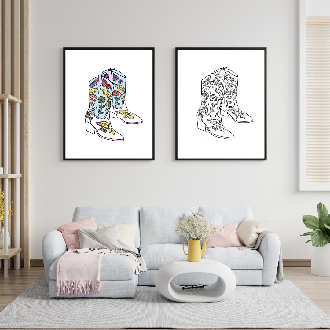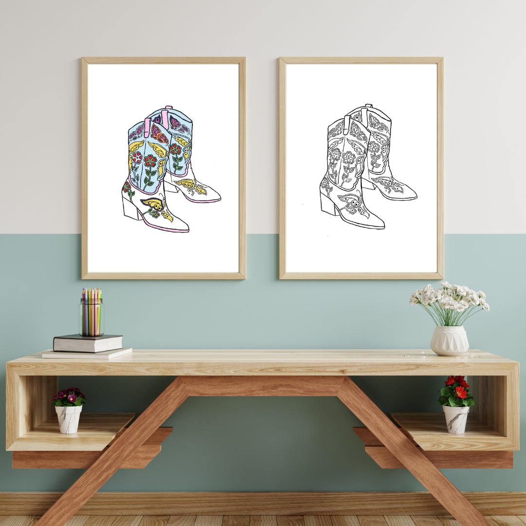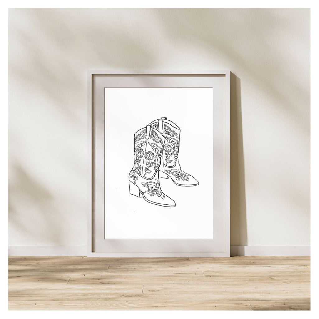 5.5x7 or 8.5x11 Butterfly Cowgirl Boot Print - your option of color or black & white