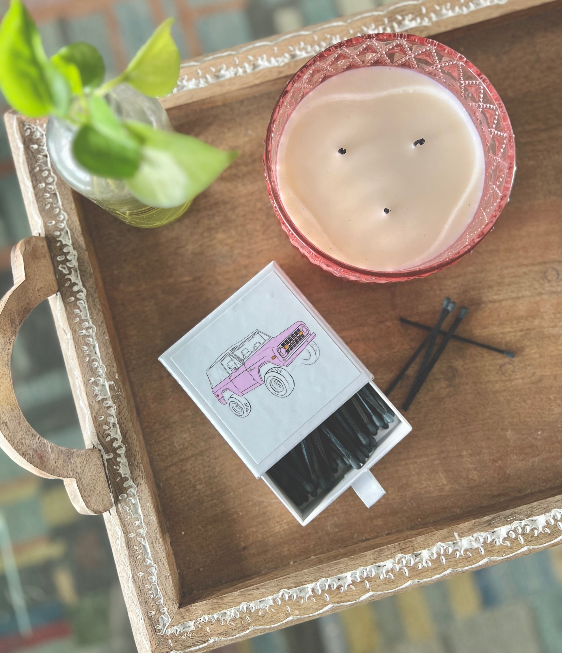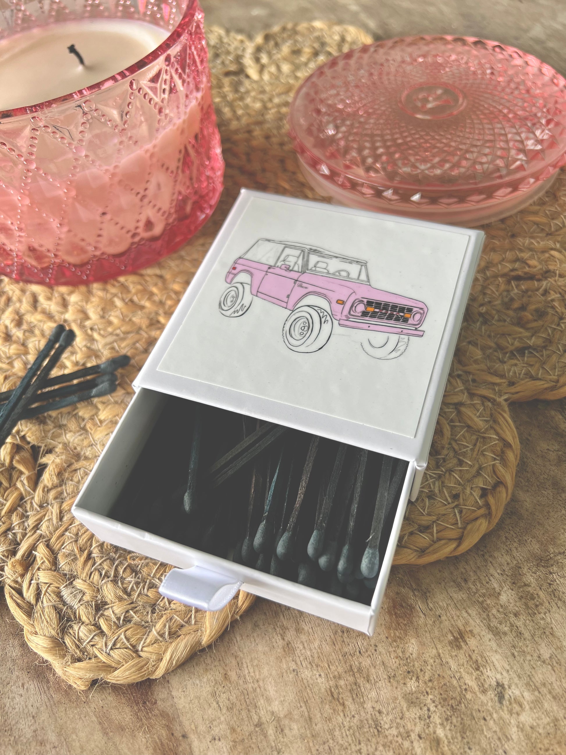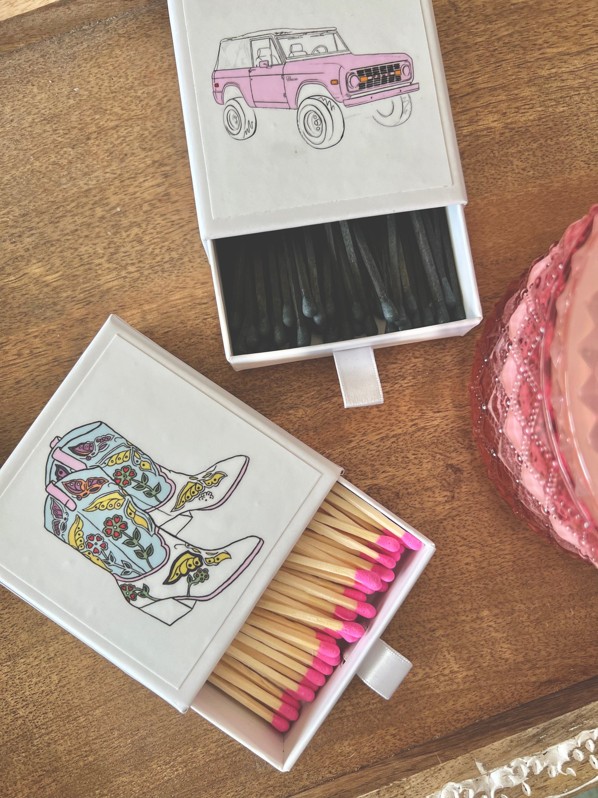 throw away your boring matches & strike up your candles (or joints) with the pink vintage bronco matches or the butterfly boot matches - option of black or pink matches