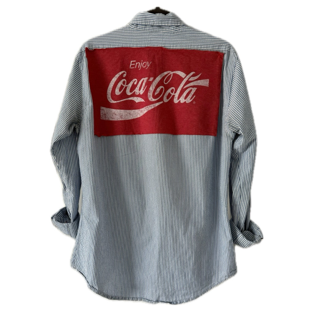Coca-Cola Retro Vintage Thrifted Graphic Upcycled Reworked Stripe Button Down Shirt Shacket