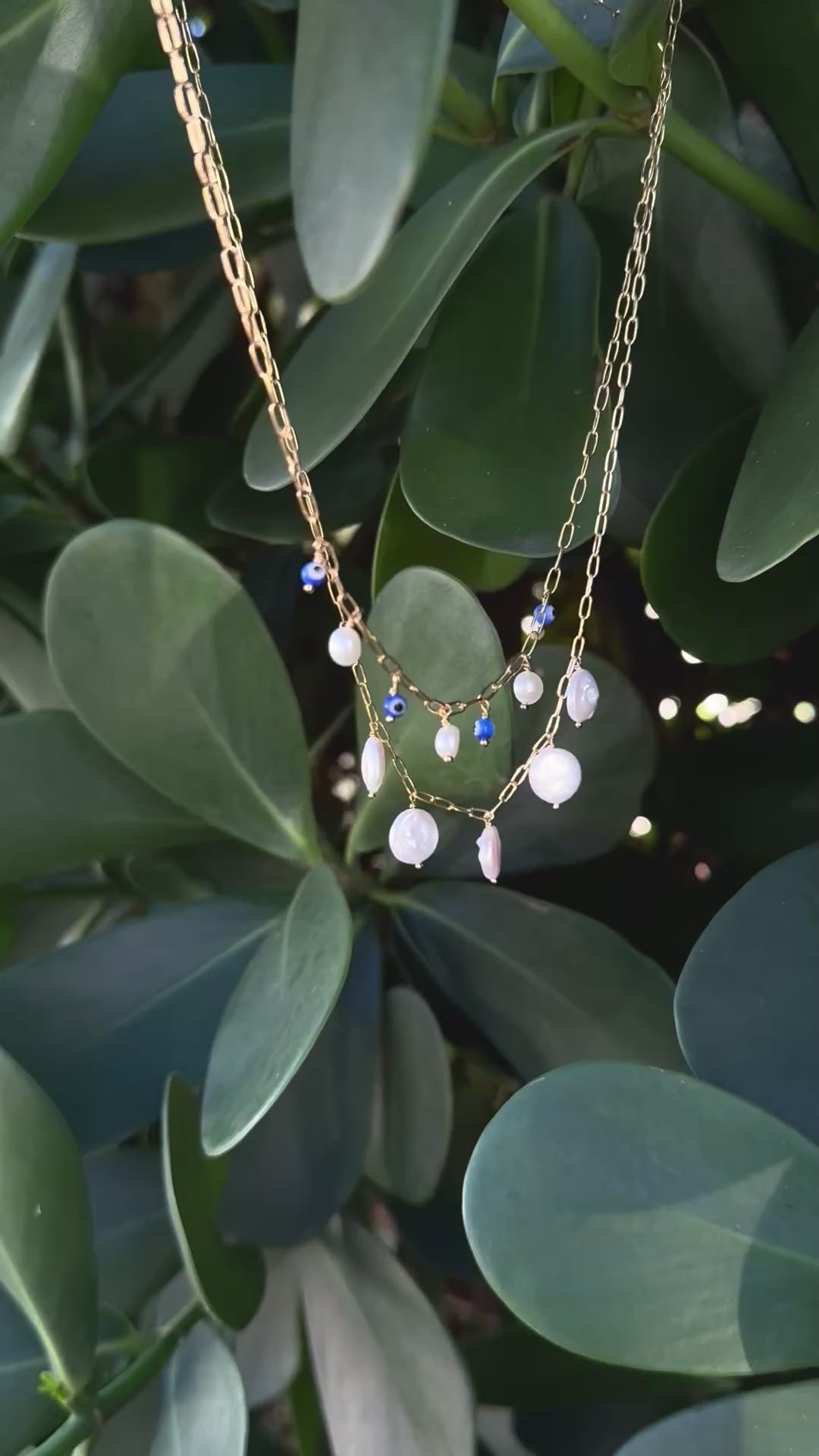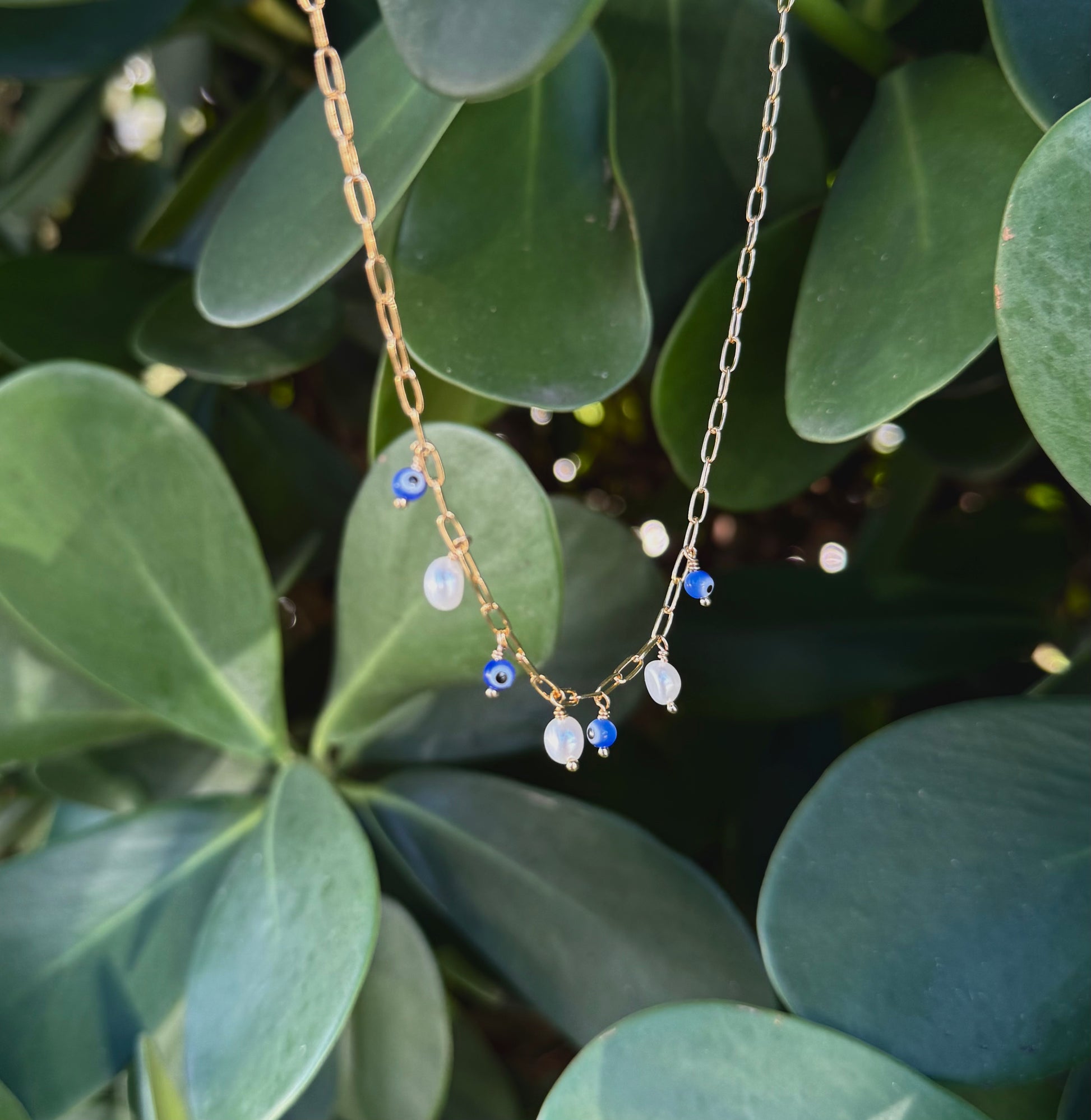 An assortment of evil eye + genuine pearl beads on a 18” gold fill paperclip chain