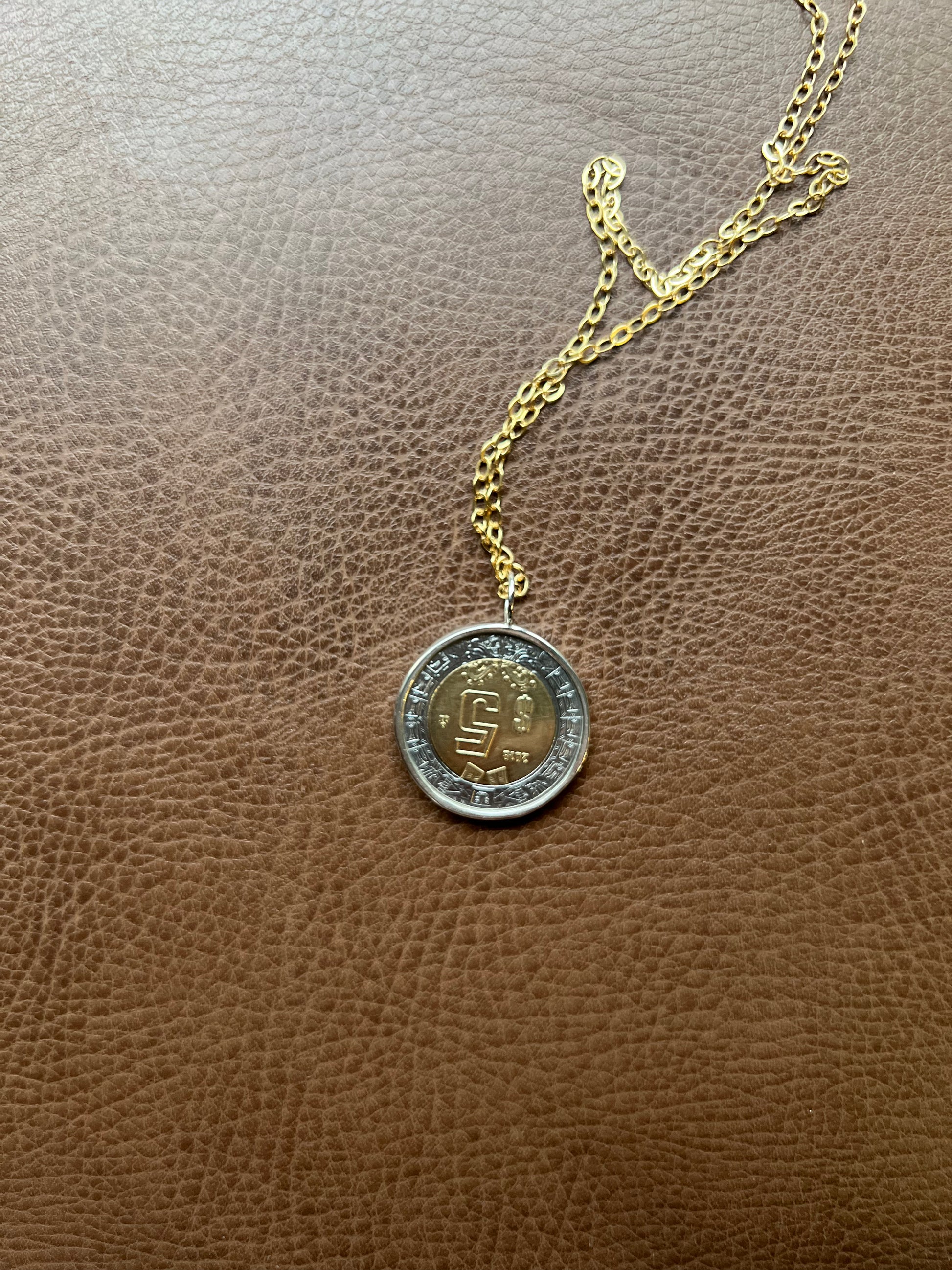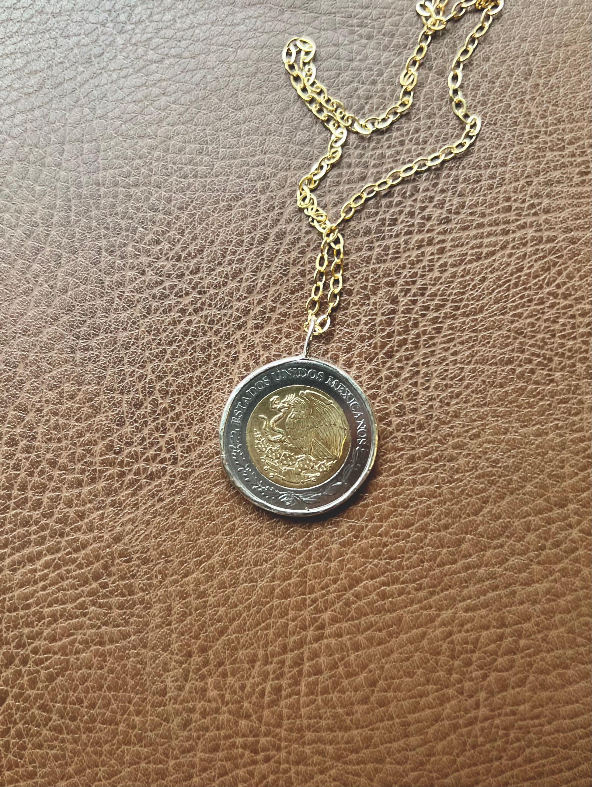 a 5 peso coin from Mexico - set by hand in sterling silver.