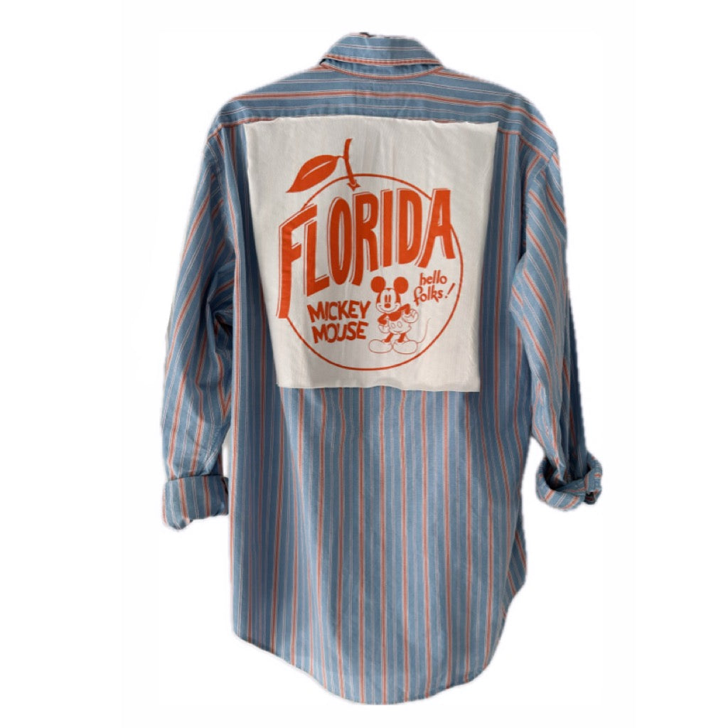 Florida Mickey Mouse Retro Vintage Thrifted Graphic Upcycled Reworked Stripe Button Down Shirt