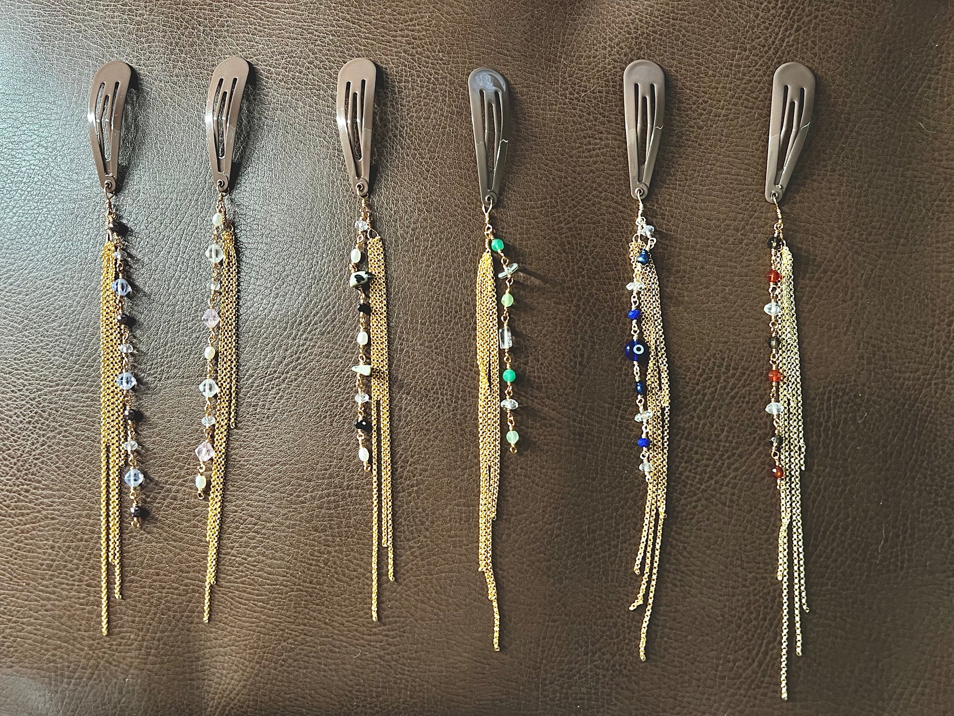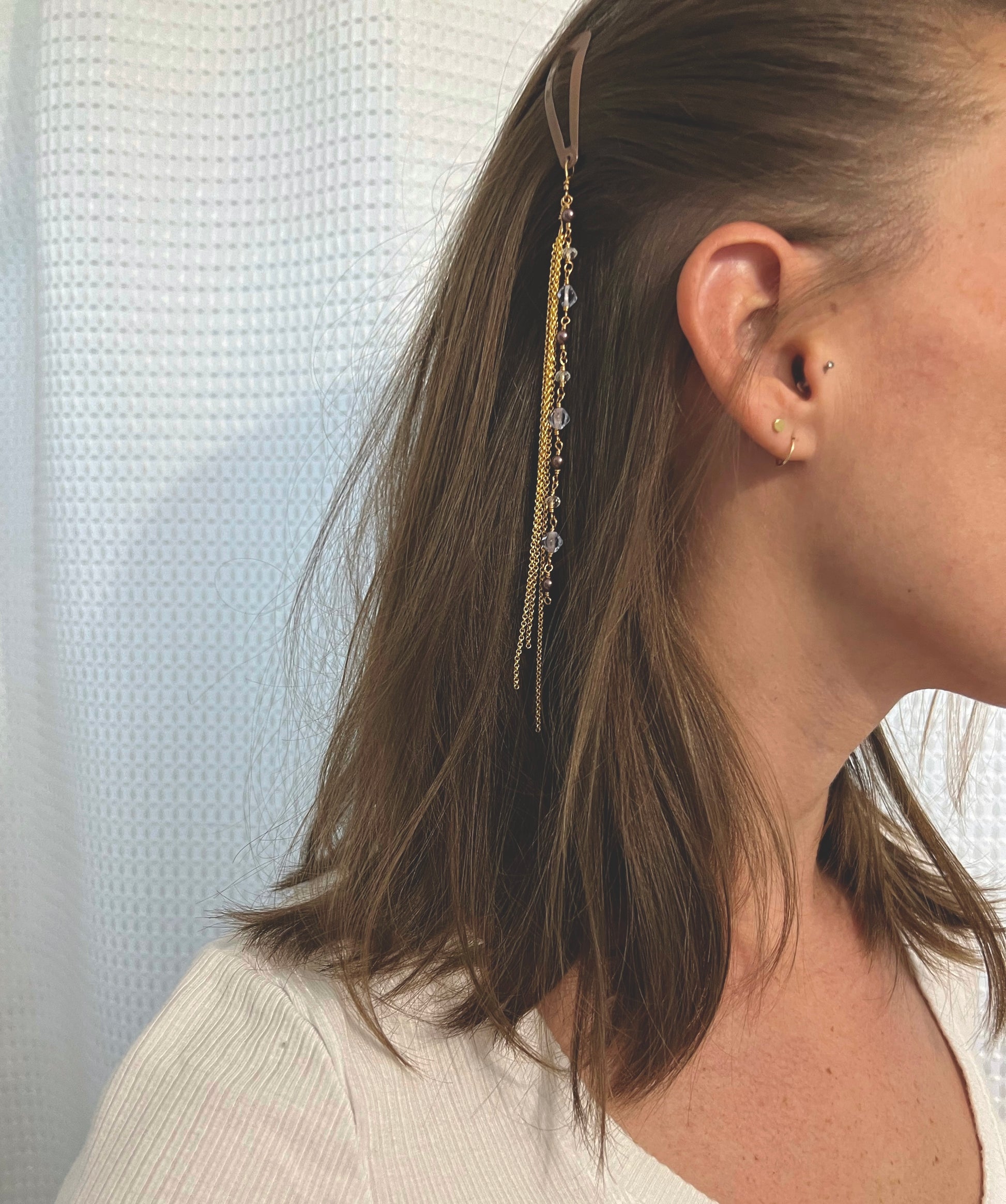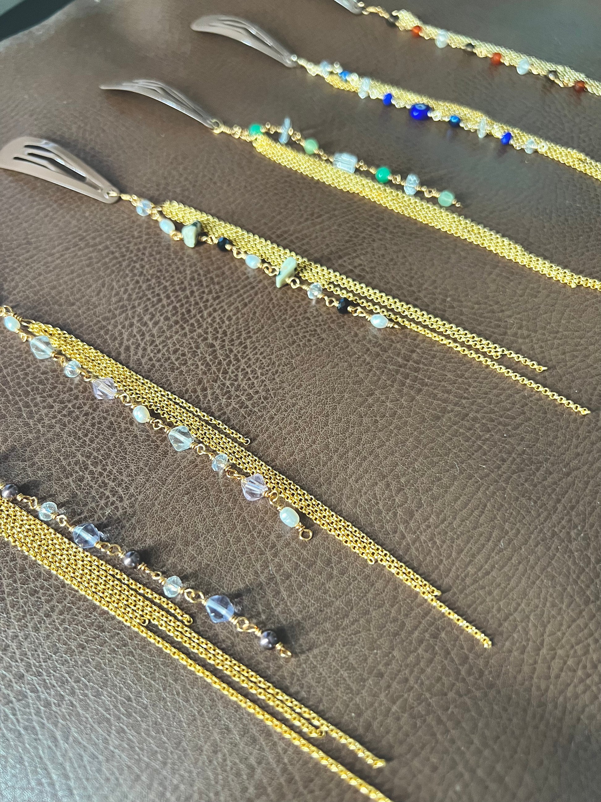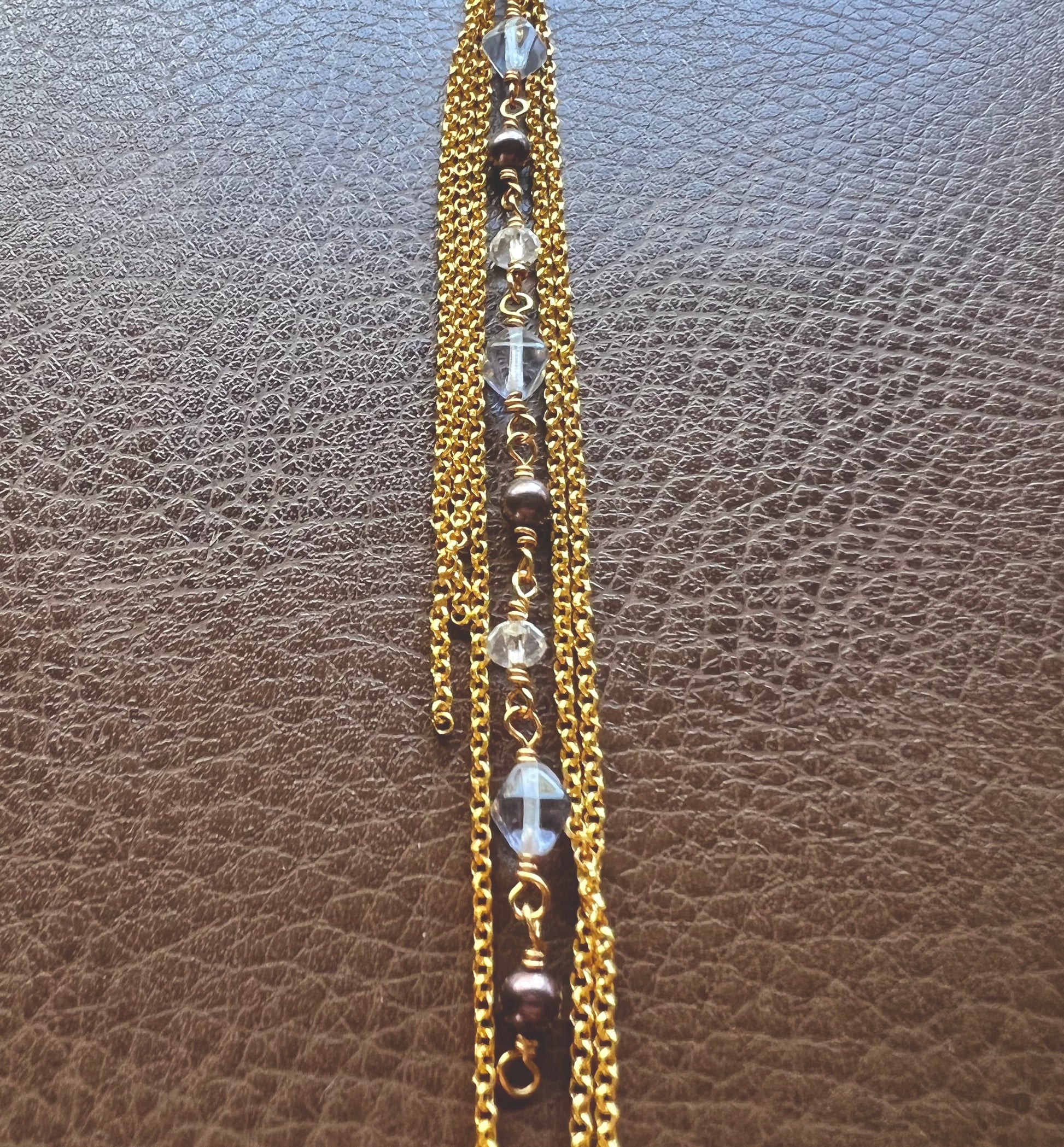 a mix of pale blue + purple glass beads - all elements rosary wrapped with gold plated chain