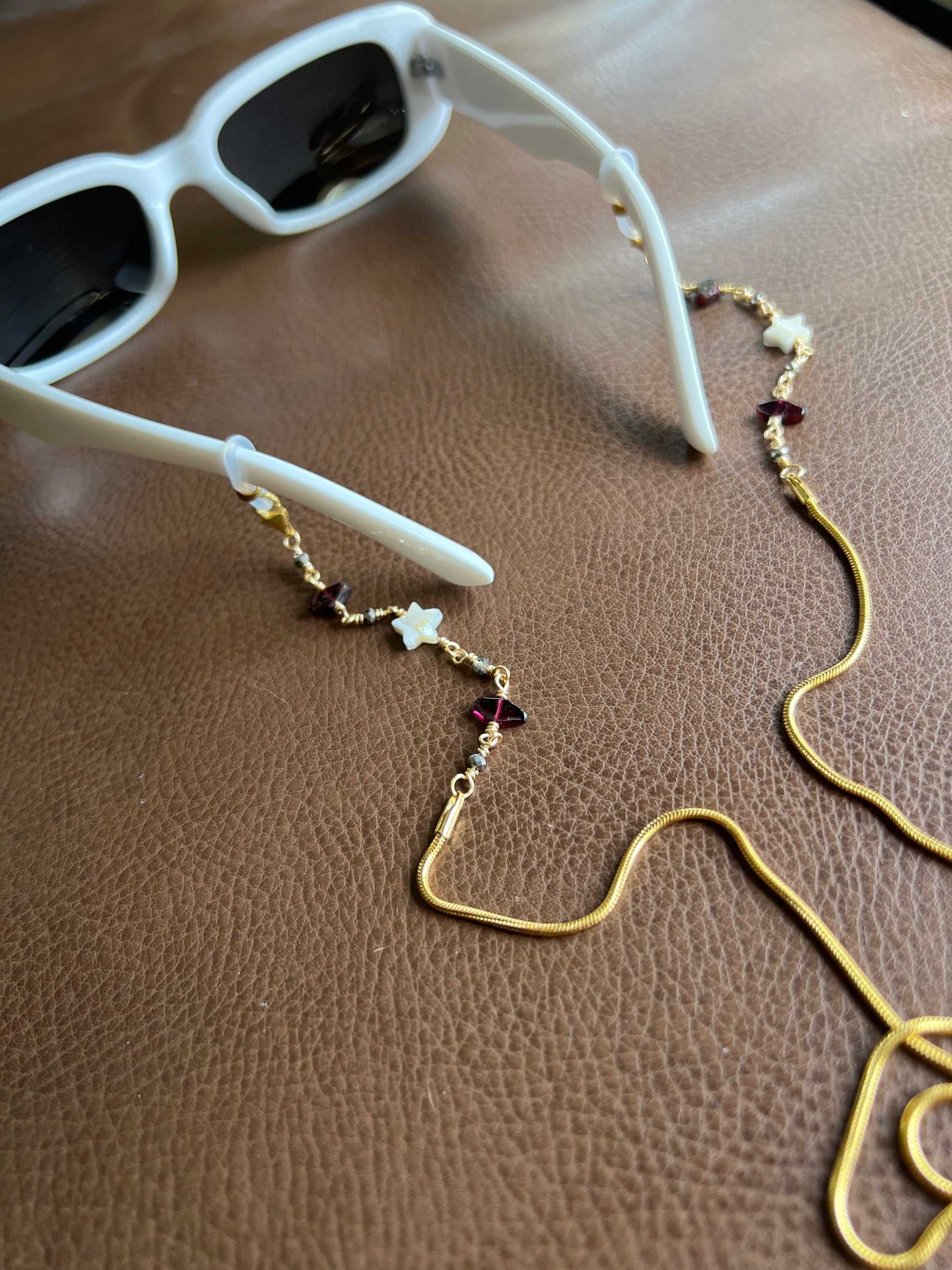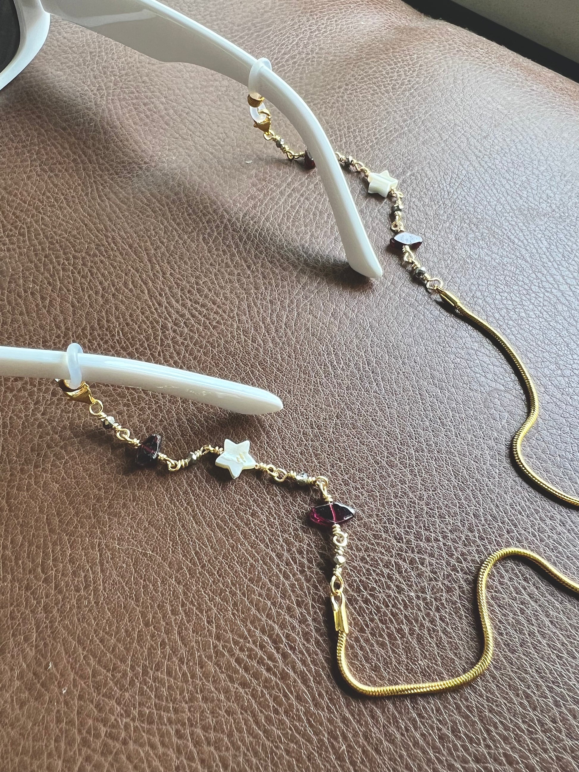a mix of shell star beads & genuine garnets + gold plated snake chain